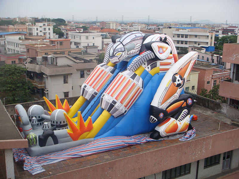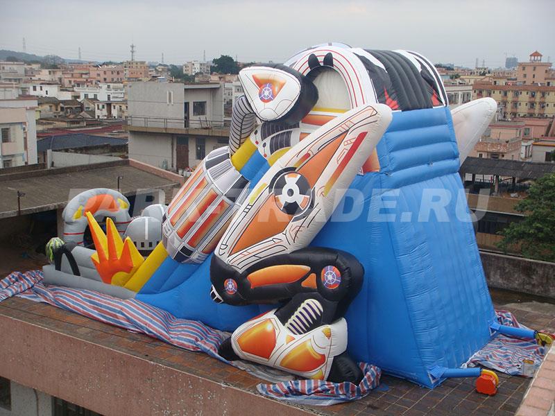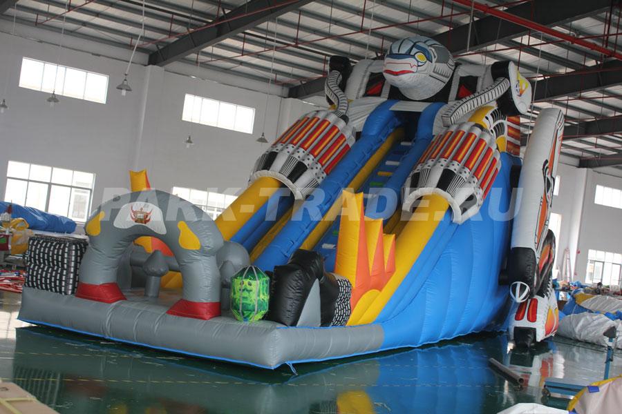 Большая надувная горка батут Трансформеры с высотой стартовой площадки 5.5 метров. Благодаря большой высоте и яркой расцветке этот батут будет виден издалека. Ни для кого не секрет, что высокие горки привлекают ребятишек. Вы можете быть уверены в том, что ваш батут всегда будет полон посетителей и принесет хорошую прибыль своему владельцу. По желанию заказчика мы можем изменить размеры, цвет и компоновку батута.
